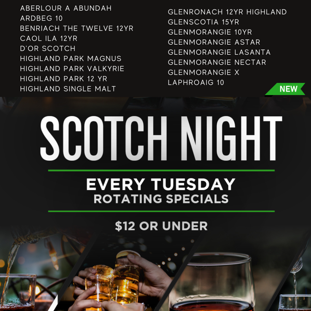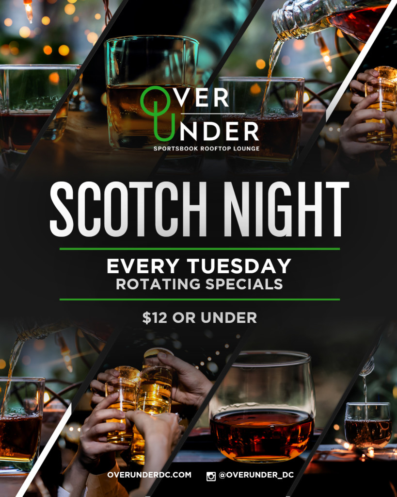 Visit Over Under on Tuesdays for fine scotch on their rooftop lounge. Current $12 rotating specials: Caol Ila 12 yr, Glenronach 12-year Highland Single Malt, Glenscotia 15-year or 18-year Single Malt and Loch Lamond 12-year or 18-year Single Malt and MORE!