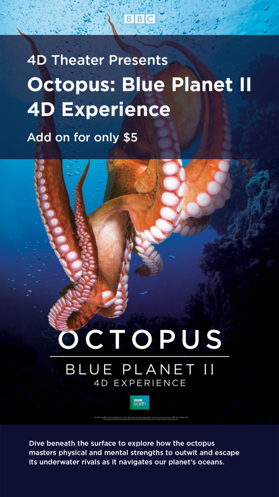 Inspired by the critically acclaimed BBC series Blue Planet II, this special-effects experience takes you beneath the surface to explore dynamic oceanic landscapes and one of the most captivating creatures that dwells there: the octopus. Discover how this eight-tentacled wonder masters physical and mental skills to outwit and escape its underwater rivals.