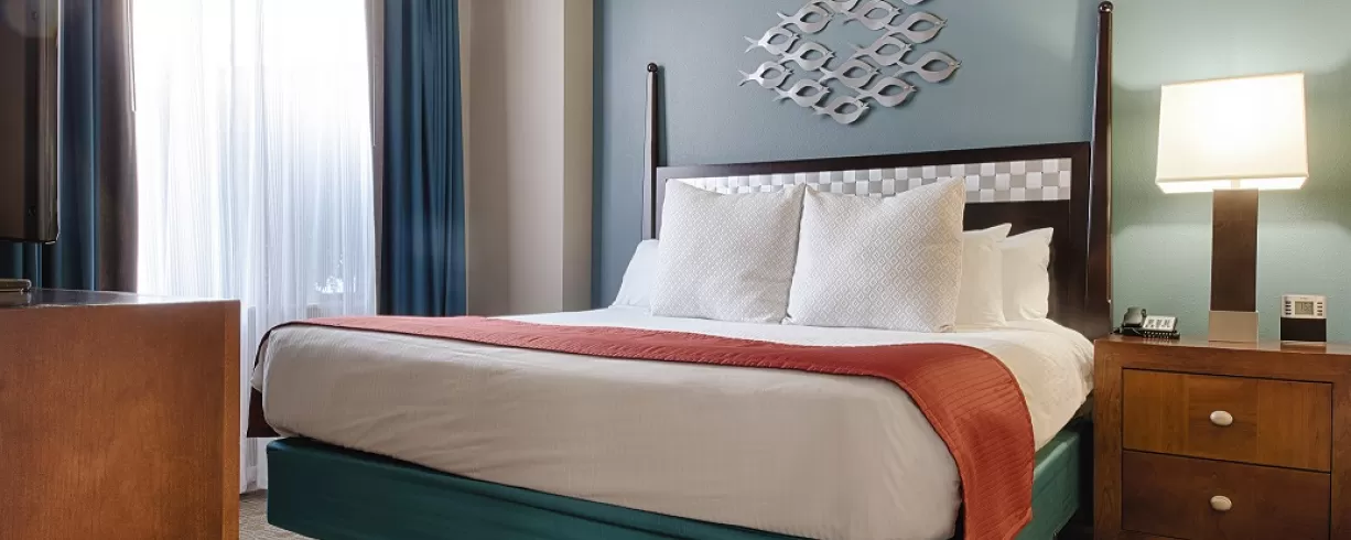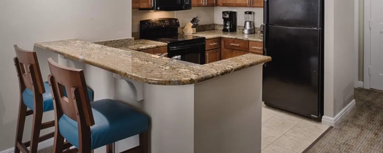 Offering spacious one-, two- and three-bedroom resort suites that comfortably sleep four to ten guests and range from 723 to 1,296 square feet. Suites feature private bedrooms with one king bed in the master, one king or two double beds in the guest rooms and a queen sleeper sofa in the living area. You will appreciate the economy of a fully equipped kitchen, separate living/dining areas and convenient comforts available in select suites, including a whirlpool tub and a private balcony.