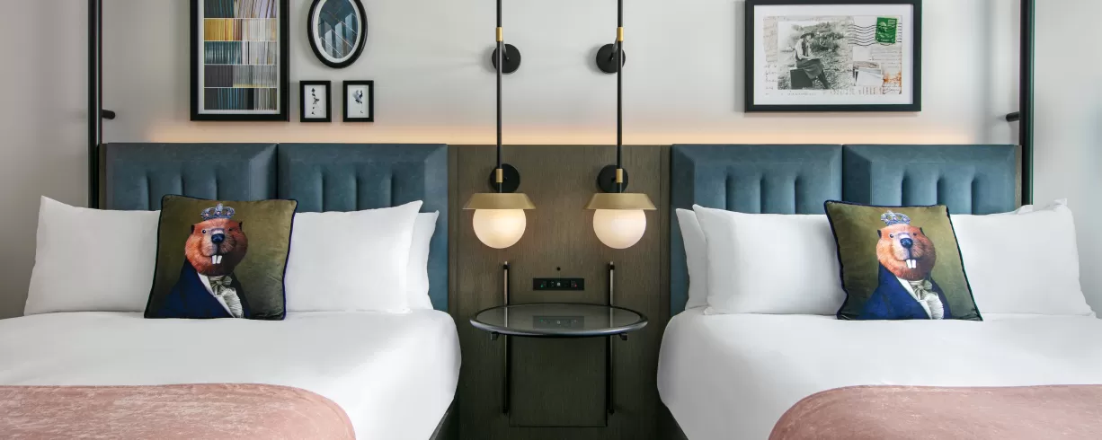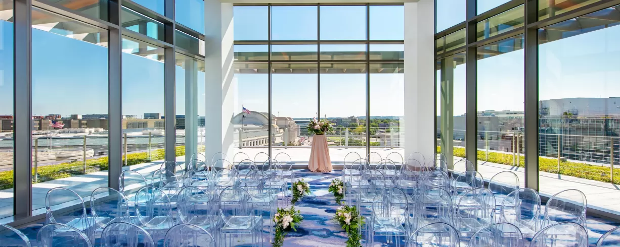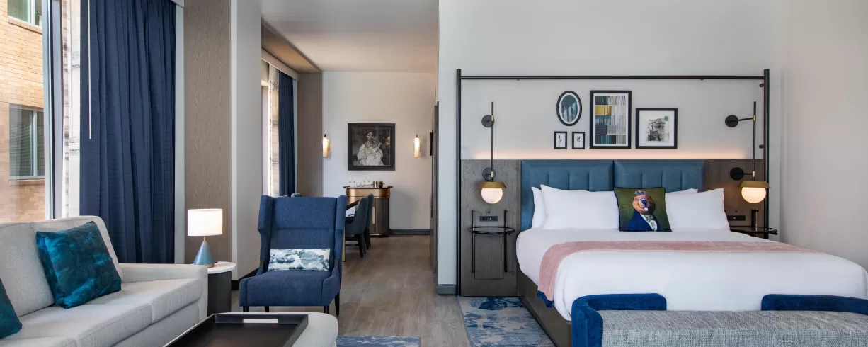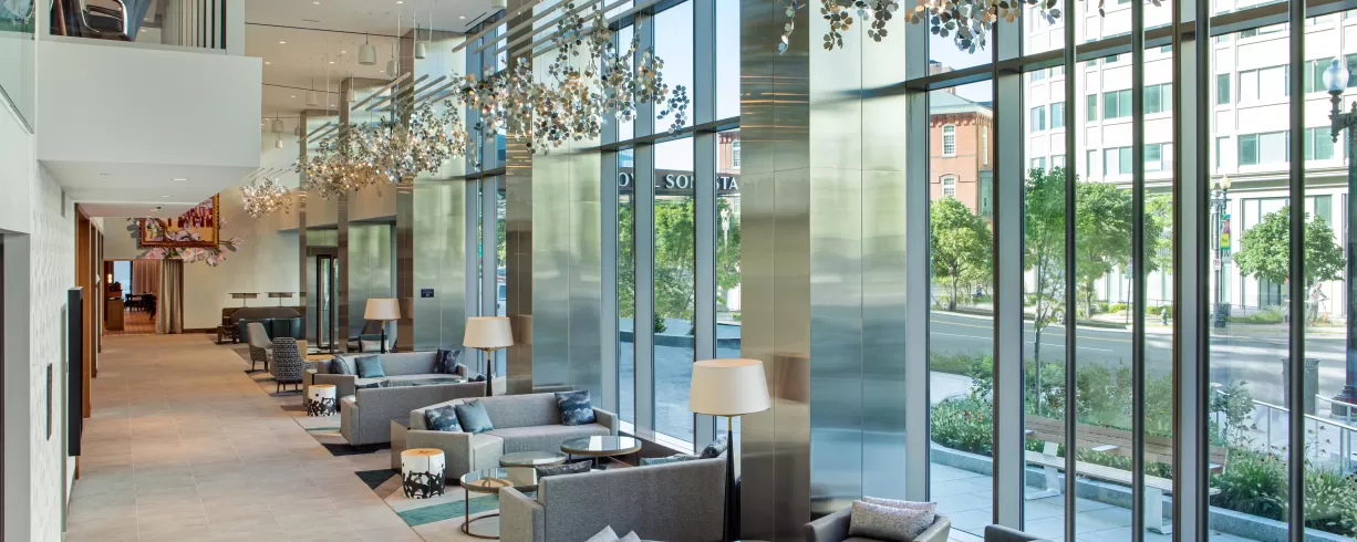 A cleansing palette of neutrals with artistic accents sets a calming tone in our lobby and well-appointed rooms. Our French bistro restaurant promises a sophisticated, savory experience. Embodying the fusion of green, wellness, and tech-forward design, our hotel is LEED Gold Certified with a WELL Certified Core/Shell and boasts an on-site fitness center and yoga studio, EV charging stations and well-equipped networking spaces throughout the property. Our penthouse conference center and ballroom with private terraces offer a breathtaking backdrop, ideal for collaboration or celebration.