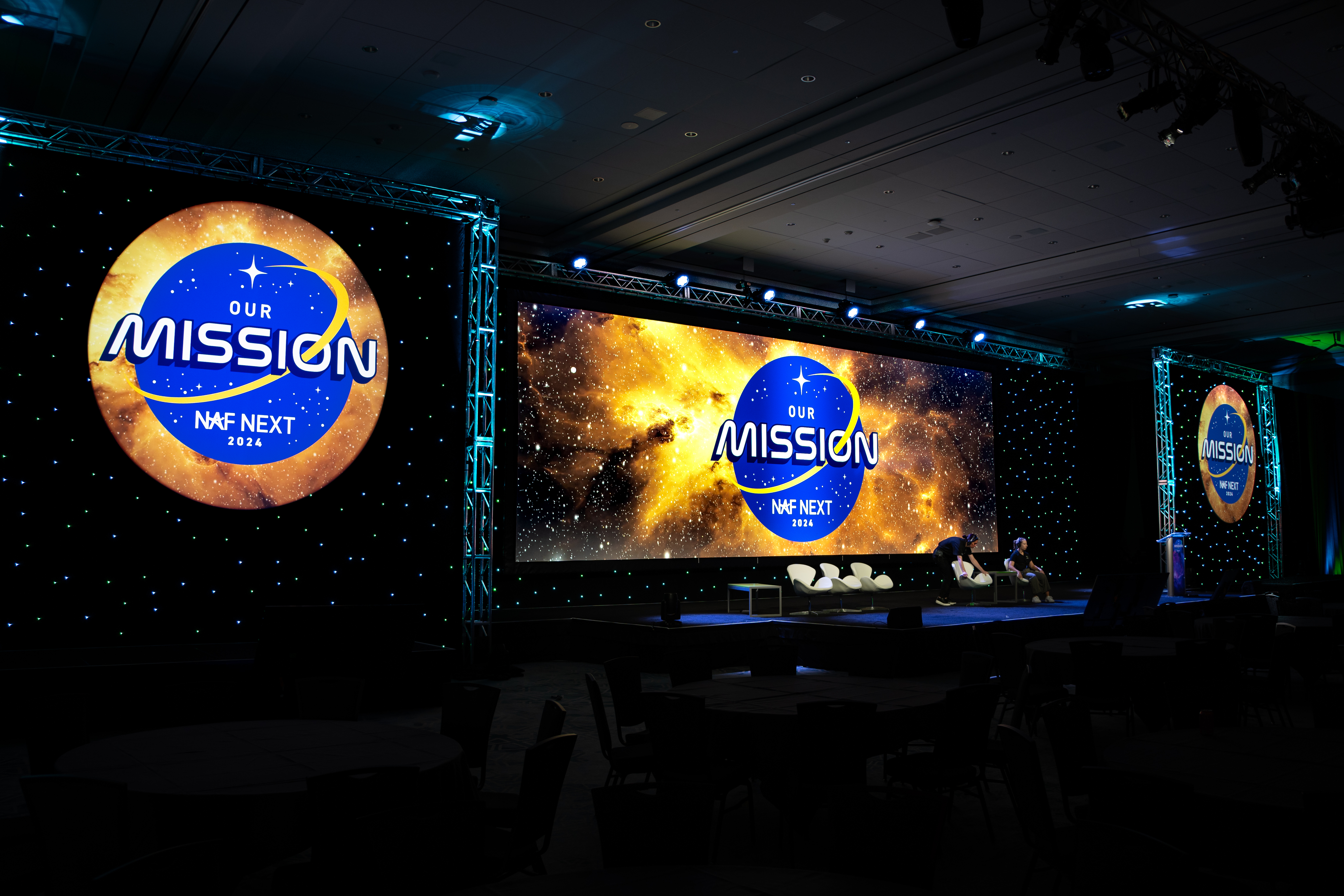 Starting in pre-production, our team will oversee production timelines, manage audio-visual logistics, lead the design process for creative materials, provide ideas and guidance for stage production and act as a liaison to other service providers that fall within our purview. Onsite, the Producer will oversee AV and scenic set-up, run technical rehearsals and create a professional rehearsal experience for stage talent, all culminating in an inspired, polished production.